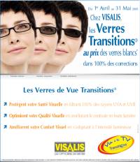 L’objectif est de faire profiter les clients de la dernire gnration des verres  teinte variable Transitions antireflet multicouches, des verres absorbant 100 % des U.V. dans 100 % des situations, pour le prix des verres blancs de mme catgorie. Cette offre promotionnelle est valable pour l’achat d’un quipement complet (1 monture + 2 verres Transitions antireflet multicouches au prix des verres blancs antireflet multicouches de mèmes géométrie, indice et puissances), à l’exclusion de tout autre avantage. L’opration sera relayée pendant la priode de l’offre en magazines TV et en presse quotidienne et appuyée en magasin VISALIS par une PLV spécifique. De plus, le Délégué à l’Information Médicale de VISALIS la présentera à chaque Ophtalmologiste des zones des Adhrents.