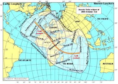 Le 3 octobre 2005, un phénomène astronomique va se produire. La Lune passera devant le SOLEIL. Le diamètre du satellite naturel de la Terre sera inférieur à celui du Soleil, l’Eclipse sera dite annulaire.
