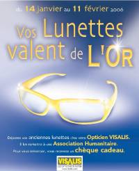 Du 14 Janvier au 11 Février 2006, les Opticiens Visalis récupèrent toutes les lunettes usagées quel qu’en soit leur état. En échange, ils remettent autant de chèques d’une valeur maximale de 54 € utilisables toute l’année 2006 pour l’achat de lunettes à verres correcteurs.