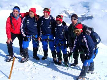 De gauche à droite: un guide de l'équipe d'Eric Loizeau, un membre du staff de l'équipe de France, Zinédine Zidane, Claude Makelele, un autre guide de l'équipe d'Eric Loizeau, et Vikash Dhorasso.